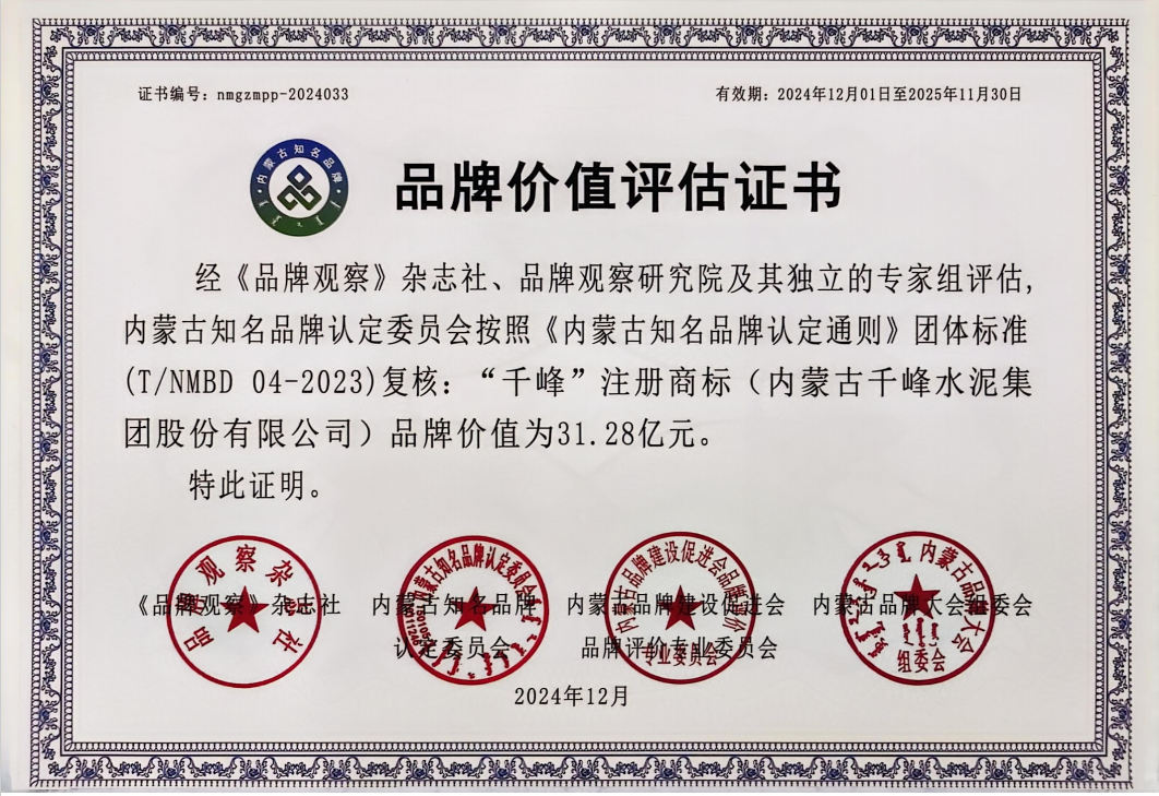 大會發布的“2024年度內蒙古品牌價值評價數據信息”,黃河集團以76.92億元的品牌價值穩居榜單第16位,這一成績不僅體現了黃河集團長期以來堅持品質至上、創新驅動的發展戰略所取得的豐碩成果,也反映了社會各界對黃河集團品牌價值的高度認可。同時,旗下千峰水泥憑借31.28億元的品牌價值位列第33位,表明公司在推動綠色建材產業高質量發展方面做出了積極貢獻。